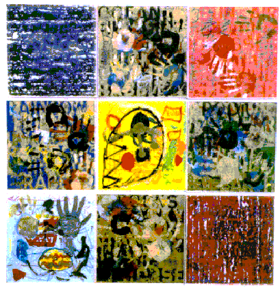Procedure: Every student contributes to the project with exactly one line, one shape, one handprint, and one signature. Josefa later framed each foam board with balsa wood, glue, and pins.