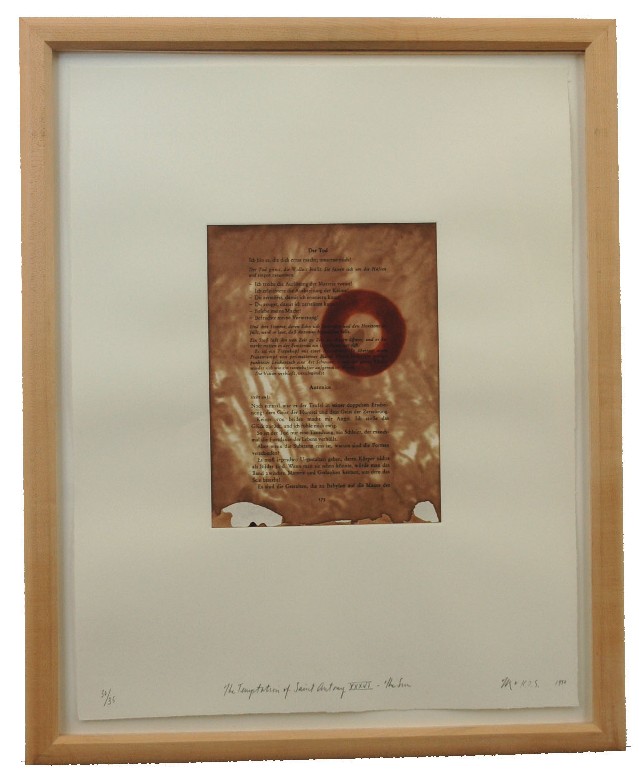 The Temptation of Saint Anthony Spit Bite Aquatint printed in red on stained xerographic tex, chine colle, edition 35 1990, 24" x 18.5" Value $1,200 Starting bid $800
