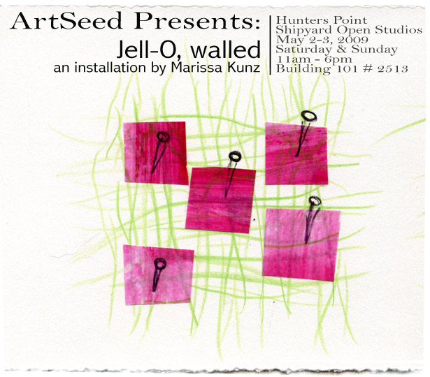 "Jello, walled" was conceived in conjunction with ArtSeed's Exhibition theme: "Structure and the Meaning of Life". The image of cherry red Jell-O nailed precariously to a wall took hold in my mind during the presidential debates of 2008, when John McCain compared understanding Obama's tax plans to nailing Jell-O to a wall. This installation attempts to realize such an elusive endeavor, if only for a moment.